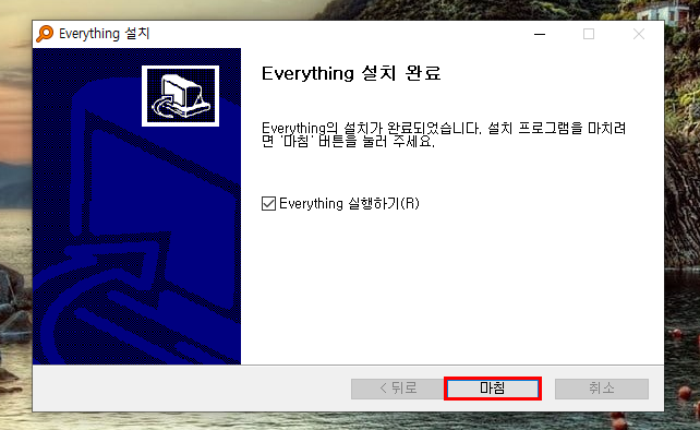 설치가 완료되었습니다. 바로 실행하실 분들은 Everything 실행하기 체크를 놔두고 마침을 누르면 됩니다. 그러면 프로그램이 자동 실행됩니다.